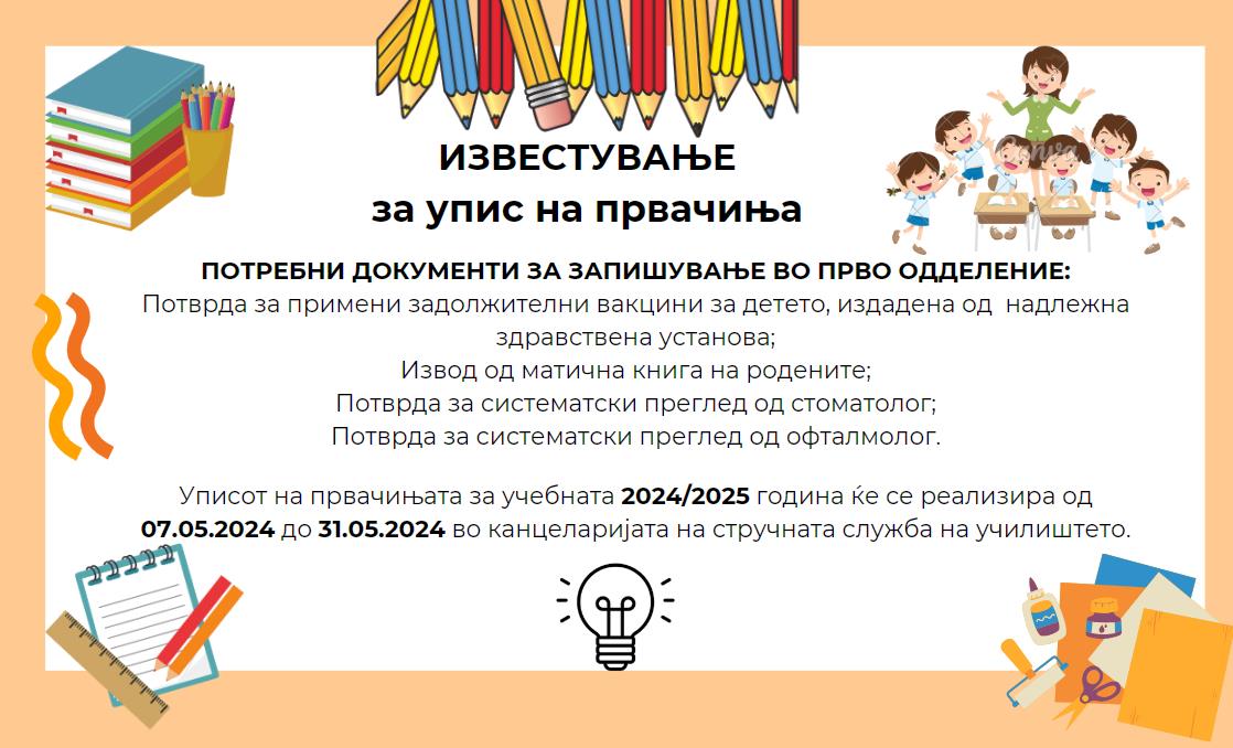 Почитувани родители, Ве известуваме дека уписот на првачињата за учебната 2024/2025 ќе се реализира од 07.05.2024 до 31.05.2024 во канцеларијата на стручната служба на училиштето.